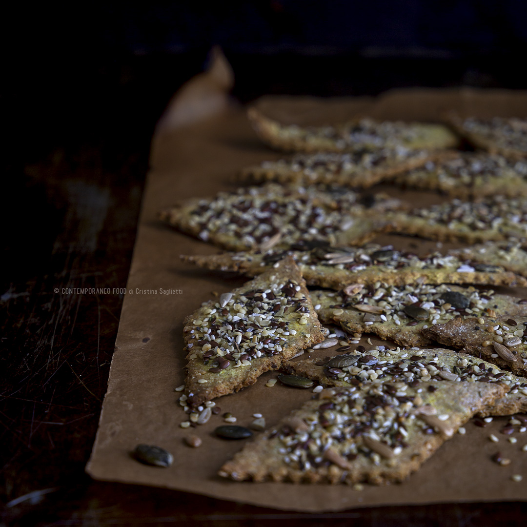 Oggi vi propongo una ricettina molto interessante perché preparata con una farina alternativa e con tante materie prime che fanno molto bene: crackers all’avena, curcuma, semi oleosi e Kefir.
