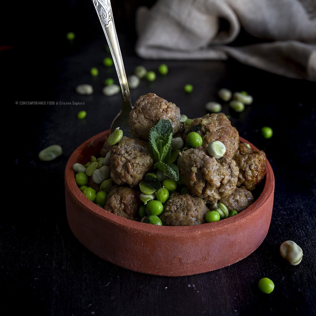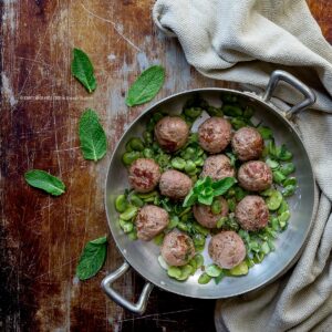 Oggi vi propongo una ricetta facilissima e molto veloce che vi permette di preparare un pasto completo in semplici mosse utilizzando davvero pochi ingredienti: polpette di carne con fave e piselli al profumo di menta e limone.