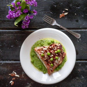 Ho pensato a questa tasca di salmone, facilissima da preparare, malgrado le prime apparenze, che ci permette di ottenere come risultato un secondo di pesce molto leggero e allo stesso tempo saporito e strutturato, perché gioca con varie consistenze: la crema di piselli freschi, la croccantezza delle mandorle tritate grossolanamente al coltello, la sinuosità dello stracchino e la consistenza del salmone.